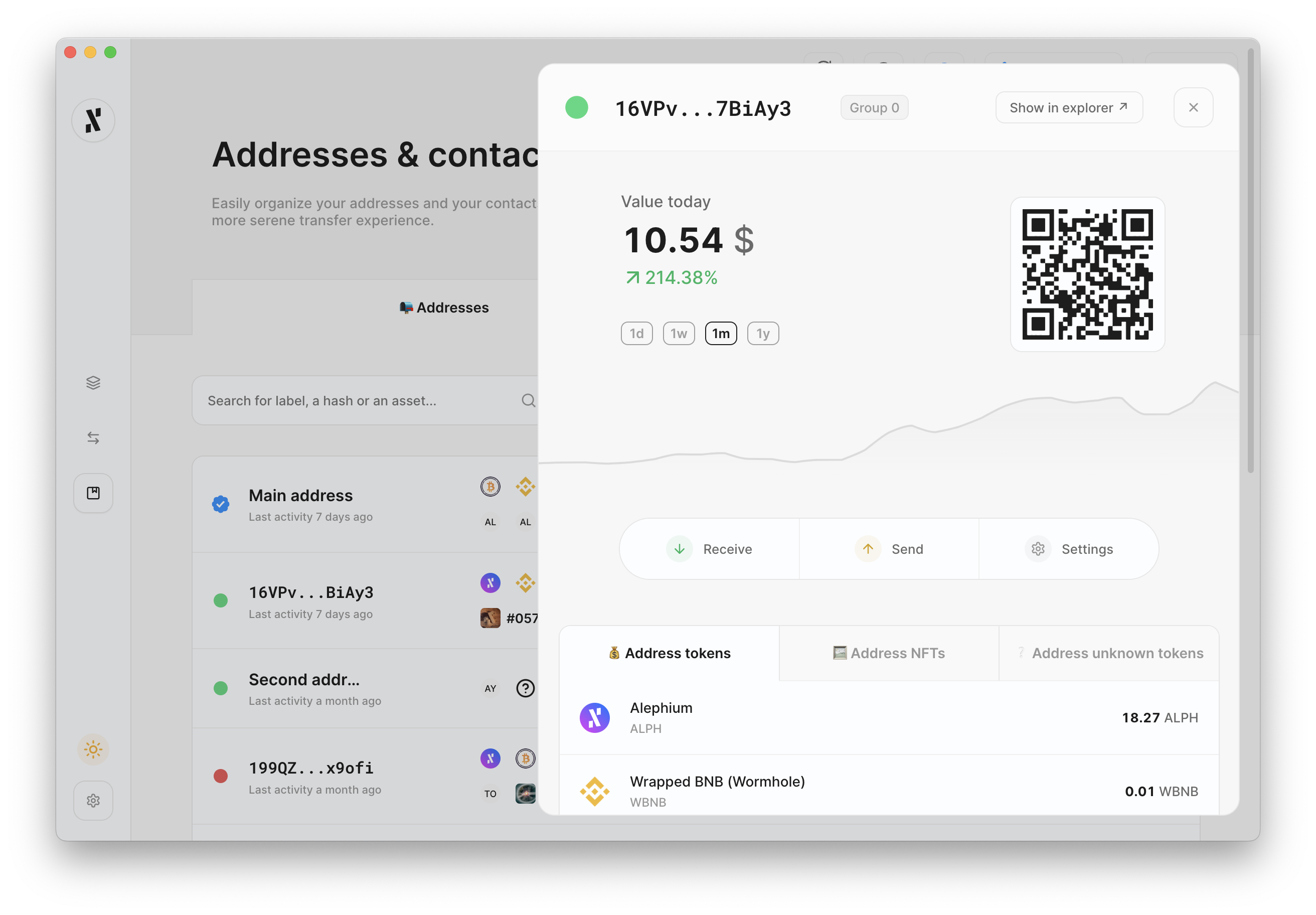 Über das Einstellungsrad oben in der Anwendung kannst du das Adresslabel bearbeiten, es als deine Standardadresse auswählen oder alle nicht gesperrten Mittel auf eine Adresse deiner Wahl übertragen.